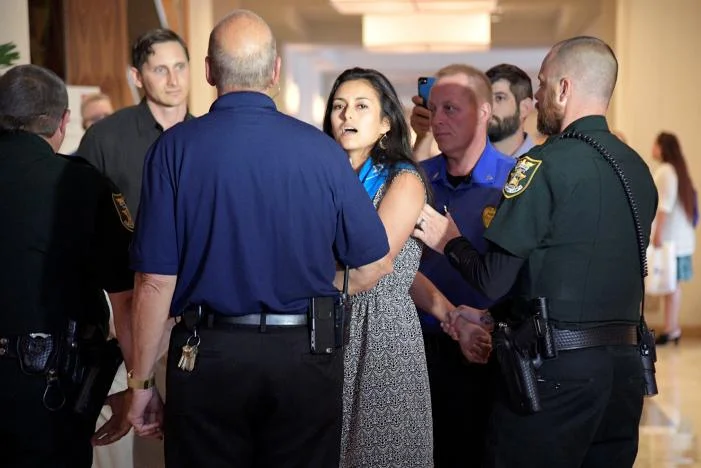 Hotel security and Sheriffs remove Jackie Fielder from share holders meeting. REUTERS/Phelan Ebenhack