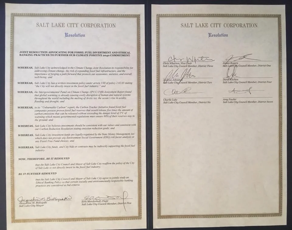 April 18, 2017 – Salt Lake City, Utah – Since 2015 Salt Lake City has had an official policy to not invest directly in fossil fuels and 14 months ago it “ recognized in the Joint Resolution Supporting the Standing Rock Sioux Tribe’s Opposition to Dakota Access Pipeline Construction the unique, sovereign relationship between Tribal Nations and the United States and discourages any action regarding the DAPL that would harm or destroy the Tribe’s ancestral lands, waters and sacred sites”. Tuesday night the Salt Lake City Council and Mayor Biskupskie reaffirmed those commitments in an historic event for the divestment movement by unanimously passing a “Joint Resolution Advocating for Fossil Fuel Divestment and Ethical Banking Practices To Further our Climate Positive 2040 Commitment. The resolution states that while the intentions of the City are clear “Salt Lake City, and City bids or contracts may be indirectly supporting the fossil fuel industry”.