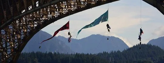 [1] The seven 10-foot by 40-foot streamers were designed by seven Indigenous artists. The artists (and their Indigenous communities) are listed below in the order in which they are being flown by the climbers, from north to south: Jackie Fawn (Yurok), Ed Archie Noisecat (Salish), Ronnie Dean Harris (Stō:lo/St’át’imc), Marissa Nahanee (Squamish and Nisga’a), Will George (Salish) and Protect the Inlet Community, Brandon Gabriel (Kwantlen), and Ocean Hyland (Salish).